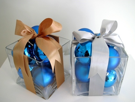Includes Glass Cube Vase filled with Christmas Balls and finished with Satin Ribbon & Bow detail.