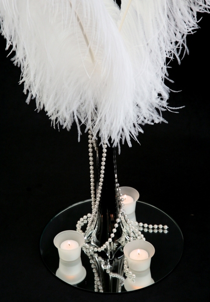Includes Black Single Stem Vase with 3 x White Ostrich Feathers, 30cm Mirror Base, Pearl Strands and 3 x Frosted Tealight Holders w 9hr Candles.