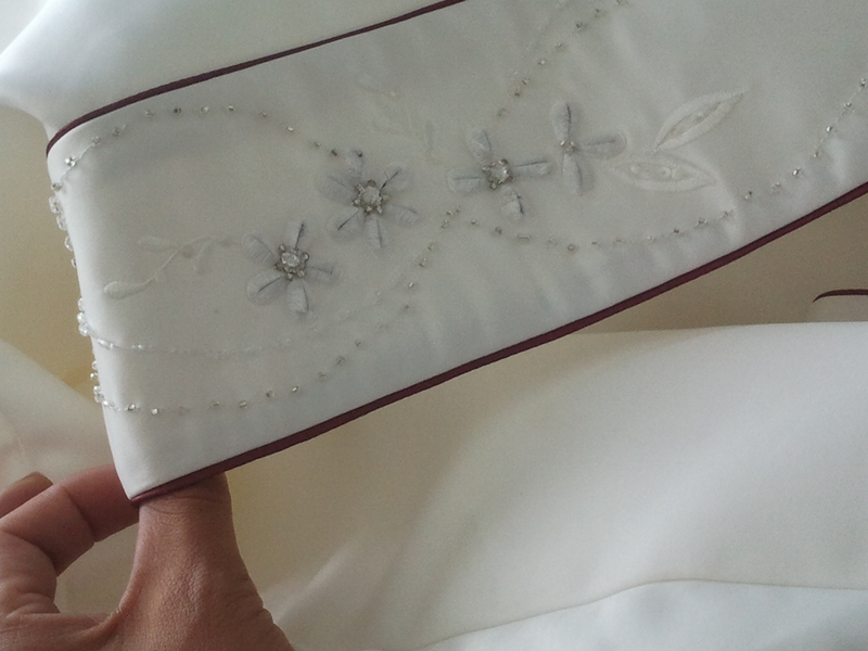 burgandy edging,swarovski chrystals along top of bodice and along the back and train.